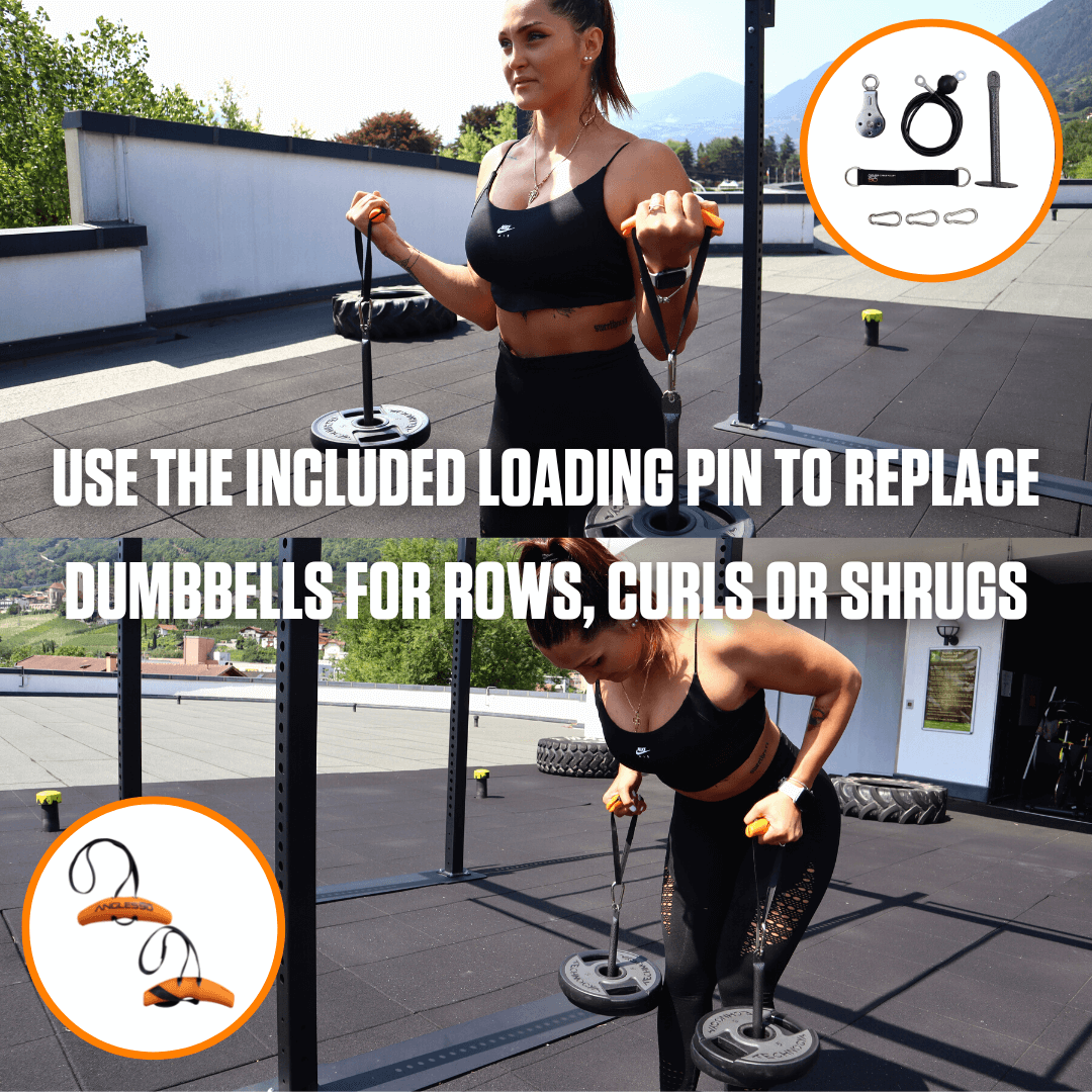The included loading pins (one per A90 Cable Pulley) can serve as a dumbbell substitute for performing biceps curls, bent-over rows, or front and lateral raises. Simply attach your Angles90 Grips to the pin (as seen in the POWER+ method).